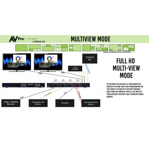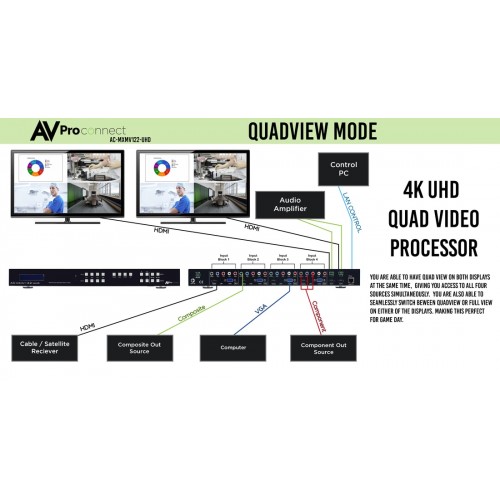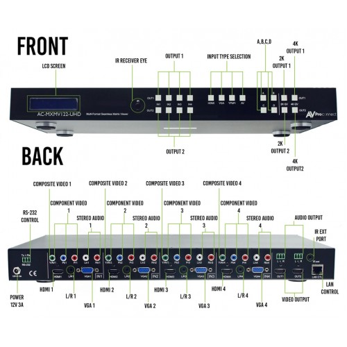 The AC-MXMV122-UHD Video Flux features 16 available (12 at a time) input options including composite, component, VGA, and HDMI. It also has the ability to do 4K Quad View or completely customize-able Multi-view configurations.