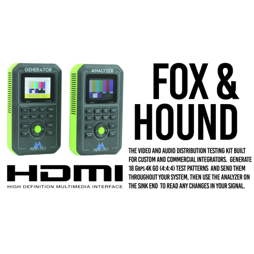 This 18Gbps Generator and Analyzer Testing Kit was built as the ideal testing unit for all custom and commercial integrators. The Fox & Hound Test Kit comes with an 18Gbps Generator and 18Gbps Analyzer. these tools allow you to confirm correct bandwidth, HDCP, resolution, timing, HDR metadata and many more options that could cause system hiccups if not treated correctly.