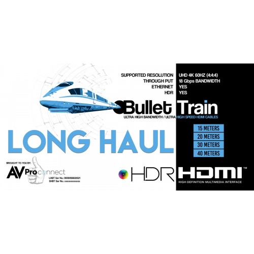 GO THE DISTANCE. Perfect for stable distribution over long distances, Bullet Train Long Haul HMDI Cables are ideal in situations where one may need a little more distance but would rather not use an extender product. Utilizing fiber optics along with copper wire, these Long Haul AOC cables give you all the features you come to expect from Bullet Train — HDR, WCG, 4K60 (4:4:4), 18Gbps, and ultra high speeds.